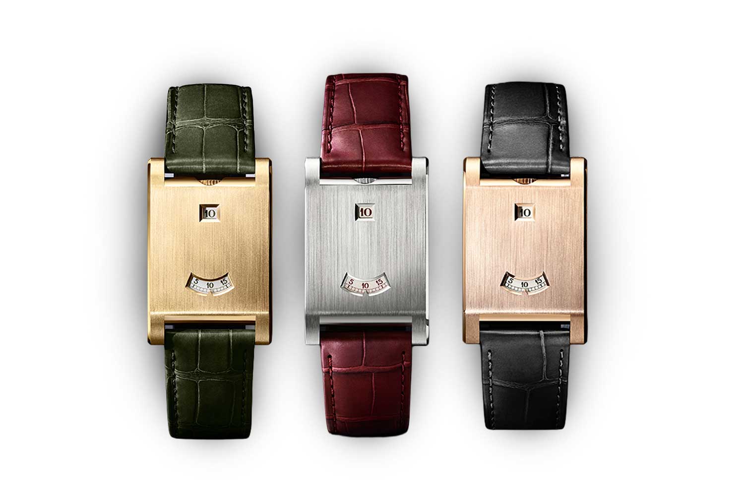 The first three show hours in a square aperture at 12, minutes in a curved window at six, just as they were on the first Tank à Guichets