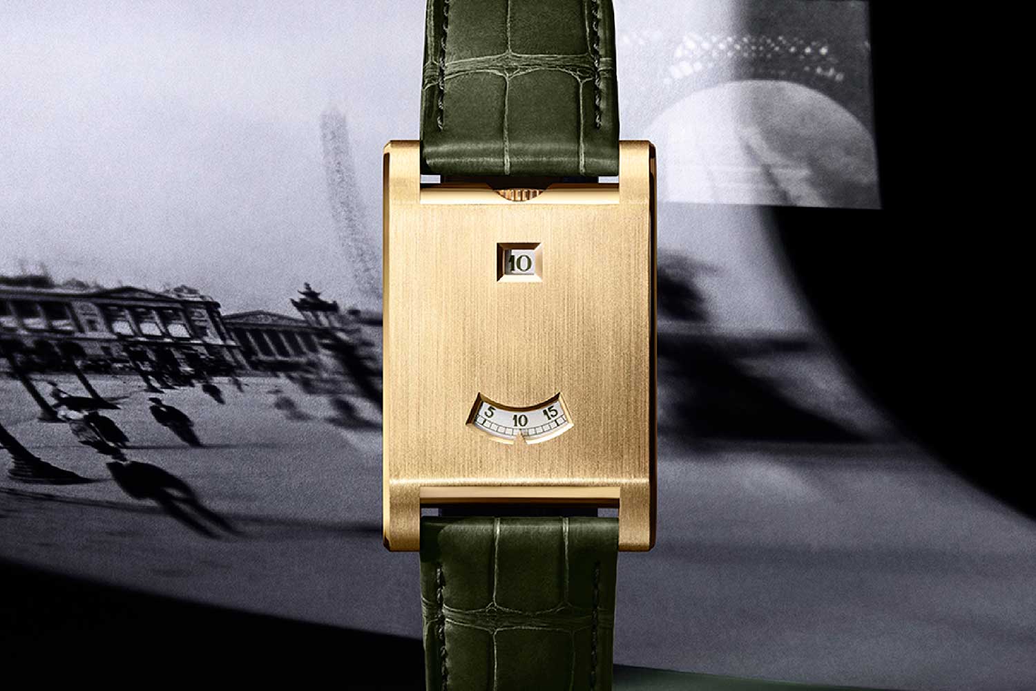 In 1928 the world was in a preiod of cultural and technological flux. Trains and the introduction of cars had shrunk distance, the jazz age was in full swing, and the visual language of the city was bold and graphic. Cartier’s Tank à Guichets did away with hands and was a piece of wearable industrial design — a mechanical object that spoke the same language as railway clocks and Art Deco façades. Hours and minutes were displayed on rotating discs that peeped out from two tiny “guichets,” or ticket windows, one for the jumping hour and another for the dragging minutes.