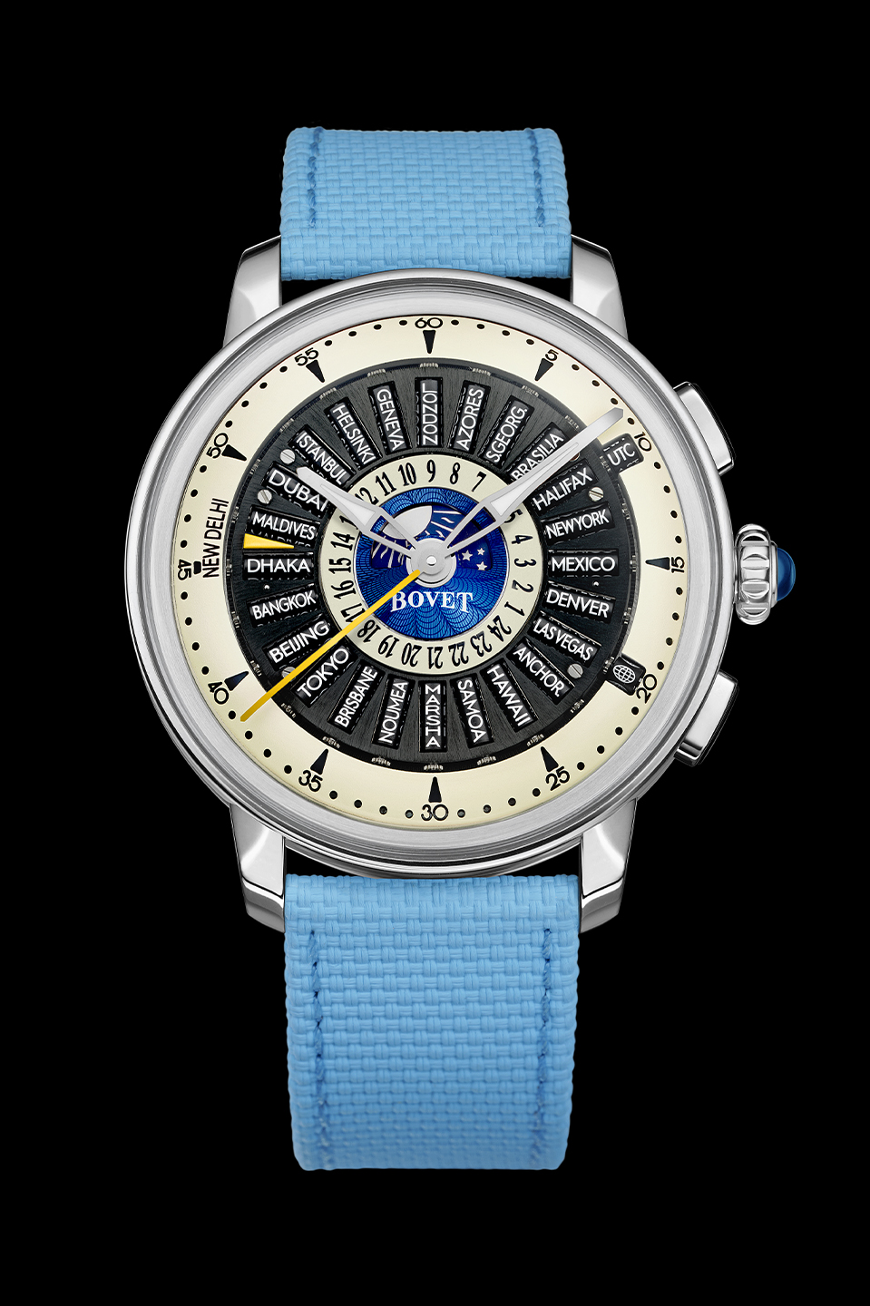 This year, Bovet has distilled the essence of that invention with the Récital 30, a cleaner, daily-wear expression of the concept. Measuring 42mm by 12.9mm, it is markedly more compact, giving pride of place to the ingenious roller-based world-time display while dispensing with the perpetual calendar and tourbillon. Notably, the display manages 25 zones, including India’s GMT+5:30, and is calibrated for the same four timekeeping periods — UTC, AST, EAS and EWT— selected via the pusher at two o’clock. A day-and-night indicator tied to local time sits at the centre of the dial.