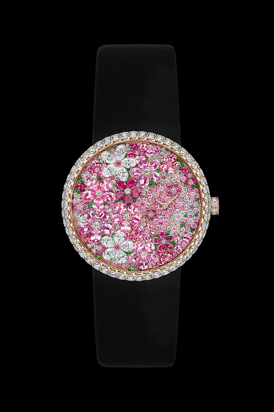 This exceptional timepiece is crafted in pink gold and adorned with 1,088 precisely hand-set stones including diamonds, pink sapphires and tsavorites arranged to evoke luxuriant garden florals. The design expresses the aesthetic of Victoire de Castellane’s Jardins de la Couture collection, with petals of gemstones forming textured clusters across the dial, bezel and case-back. With more than 150 hours of painstaking gem-setting hand-work, the work is a glittering celebration of Dior’s mastery of haute-joaillerie watchmaking.