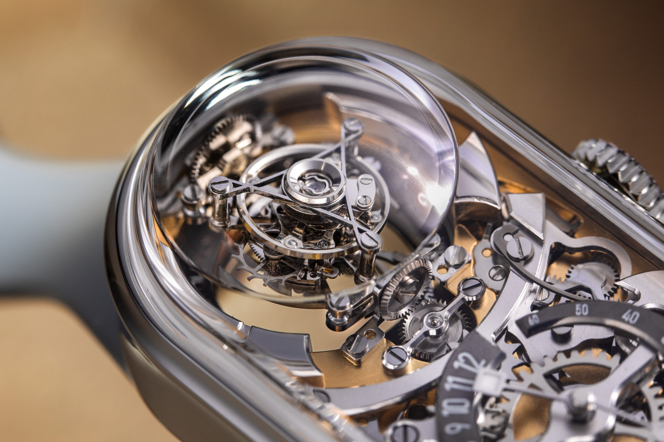 Our vision for this limited edition was to strike a balance between avant-garde modernity and the timeless elegance of traditional watchmaking. For this special edition, we replaced the original gunmetal gray baseplate with a frosted gold finish, lending the piece warmth, depth and refinement.