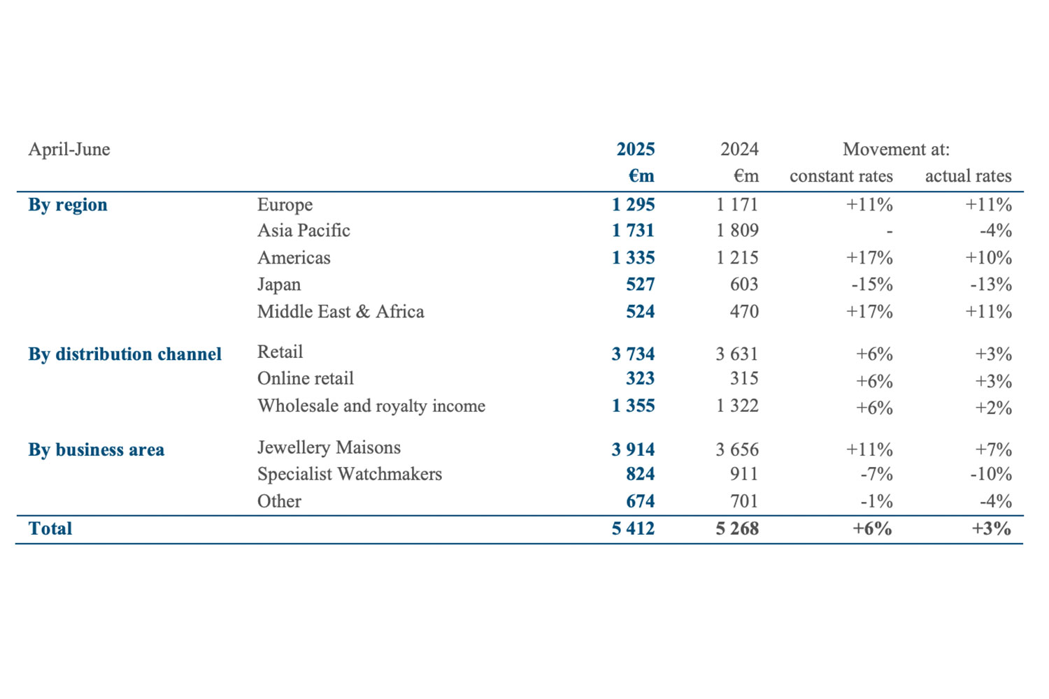Group sales reached €5.412 billion for the quarter ending 30 June 2025, up +6% year-on-year at constant exchange rates (+3% at actual rates). Sales at the jewellery maisons (Cartier, Van Cleef & Arpels, Buccellati, and Vhernier) rose +11% at constant FX to €3.914 billion. This double-digit growth outpaced all other divisions and was supported by demand across all regions except Japan. It is the third straight quarter the jewellery houses have achieved double-digit increases.