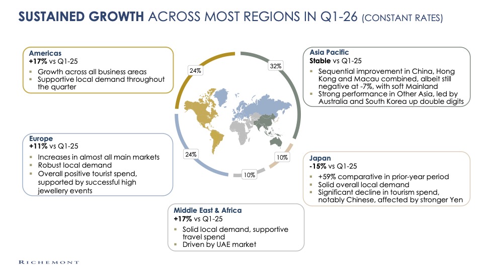 Meanwhile, after a star performance last year, Japan reported a -15% sales drop at constant FX, the weakest among Richemont’s regions. This was expected, local demand and inbound tourists (especially from China) drove a huge boom. In Q1 FY2026, Japan’s local demand remains “solid” — wealthy Japanese shoppers are still buying luxury even as tourism figures drop.