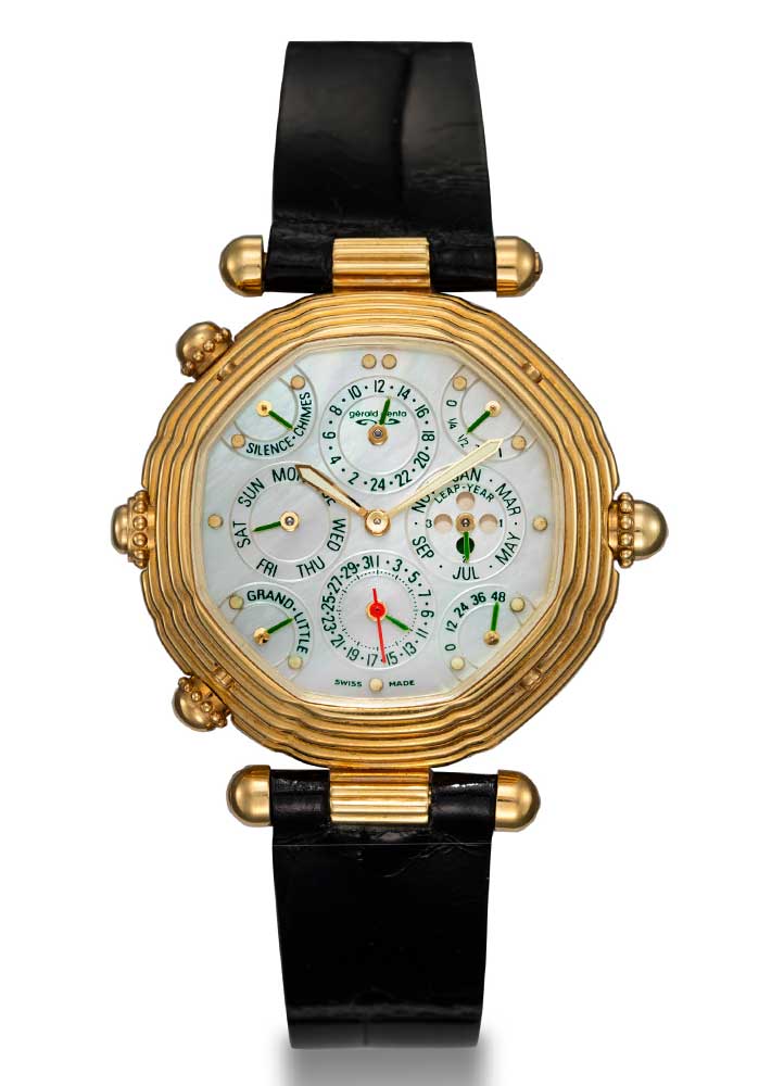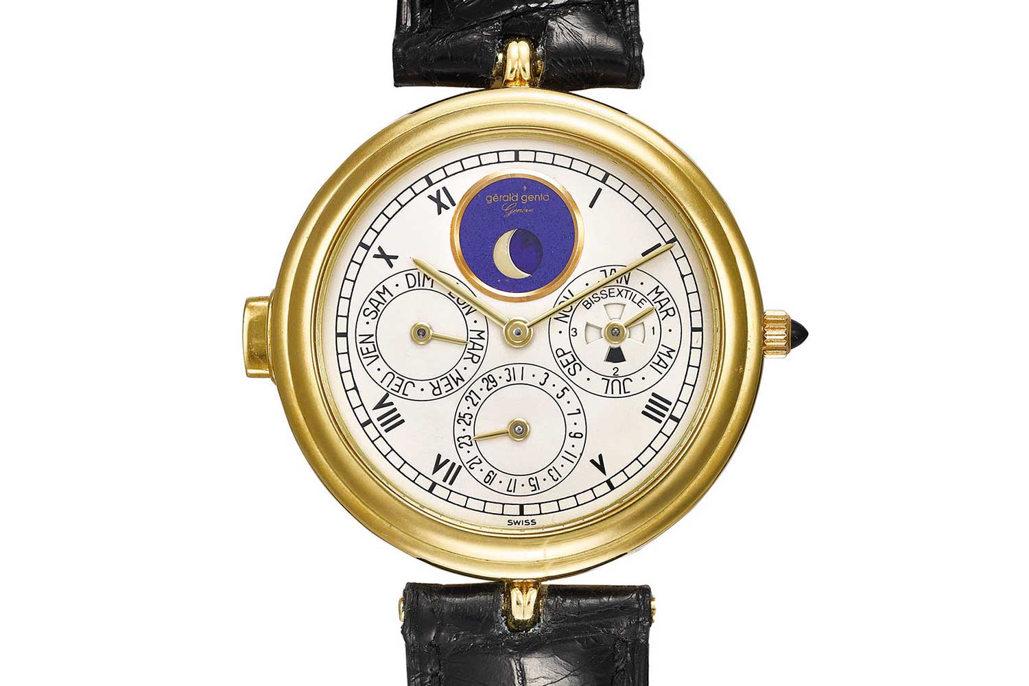By the late 1970s, at Hattori’s request, Genta undertook the design of the Credor Locomotive. This watch was the only piece outside his own brand that Genta named himself. The Seiko Credor Locomotive featured an octagonal case and exposed screws — design elements that echoed his most iconic works. After the Locomotive, Genta began to shift away from steel sports watch designs, spurred on by Hattori. “With the Locomotive, Gerald had expressed what he wanted to say with these industrial-looking watches,” Evelyne explains. “After that, he sought to explore complications and that came through with the perpetual calendars and the sonnerie,” says Evelyne.