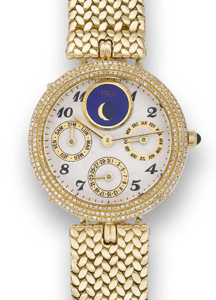 The latter part of Genta’s career beautifully illustrates the artistic side of his duality. Following the remarkable success of his ultra-thin minute repeaters and perpetual calendars, Genta’s creativity took flight, particularly in crafting one-off custom pieces for the rich and famous. He began to reimagine traditional Swiss watchmaking, embracing an eccentric, often extravagant aesthetic. The modernist ideology of “form follows function” gave way to a fearless exploration of ornamental design. His most audacious creations were commissioned by the Sultan of Brunei. One notable piece, showcased at Christie’s Dubai last year, was a yellow gold, octagonal perpetual calendar that dazzled with its harmonious angles and exquisite details. Set with baguette-cut sapphires and diamonds, the mother-of-pearl dial displayed the day, date, month, and phases of the moon on a striking blue lapis lazuli disc. This masterpiece, complete with an 18k yellow gold bracelet, fetched an impressive $37,000 at auction—a testament to Genta’s inimitable legacy in the world of luxury watchmaking.