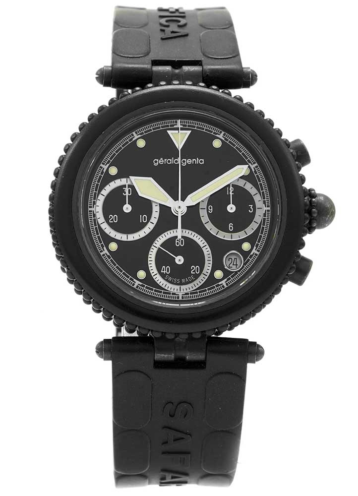 One of Mr. Genta’s groundbreaking innovations was the introduction of carbon fiber in watchmaking, notably showcased in the Success Quantième Perpétuel Ref. G3374.7. He began using this avant-garde material for dials around 1988, extending its application to bezels and bracelet links. Genta also revolutionized watch design with two new hand shapes: the large triangular hands of the Ice Crystal series and the ‘sword’ hands, which became prominent in the Arena collection during the mid-1990s. While early Gérald Genta watches typically had a traditional fluted crown or those set with a sapphire or diamond, in the late 1980s Genta introduced the dome-shaped elevated crown with beads that became a signature of the Classic, Gefica, Success and Arena collections.
