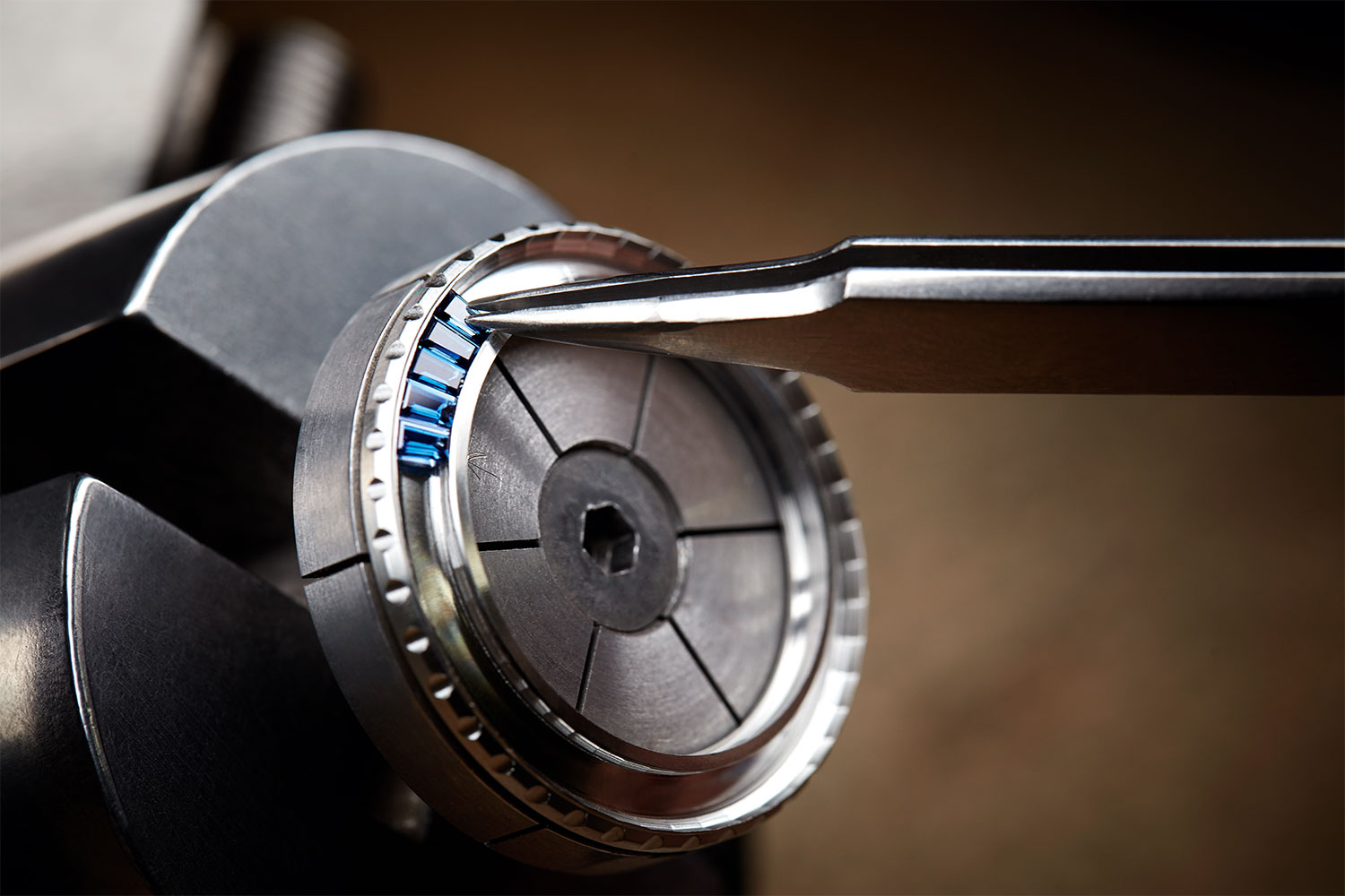 Case: 38mm; matte blue highly resistant ceramic and steel with black coating, bezel set with 34 baguette-cut blue sapphires; water-resistant to 50m