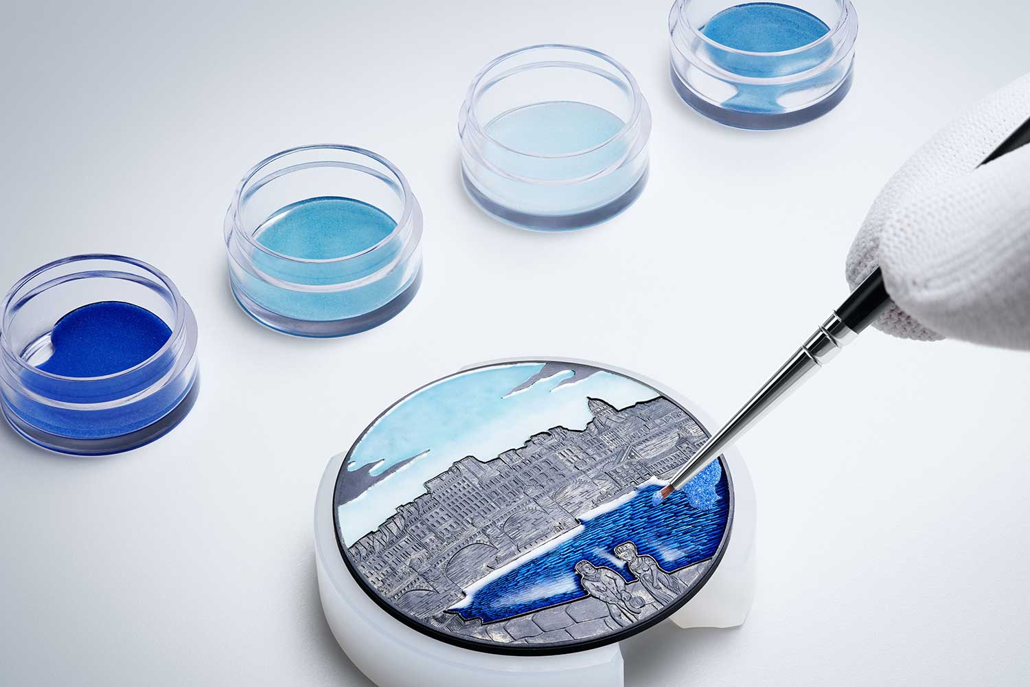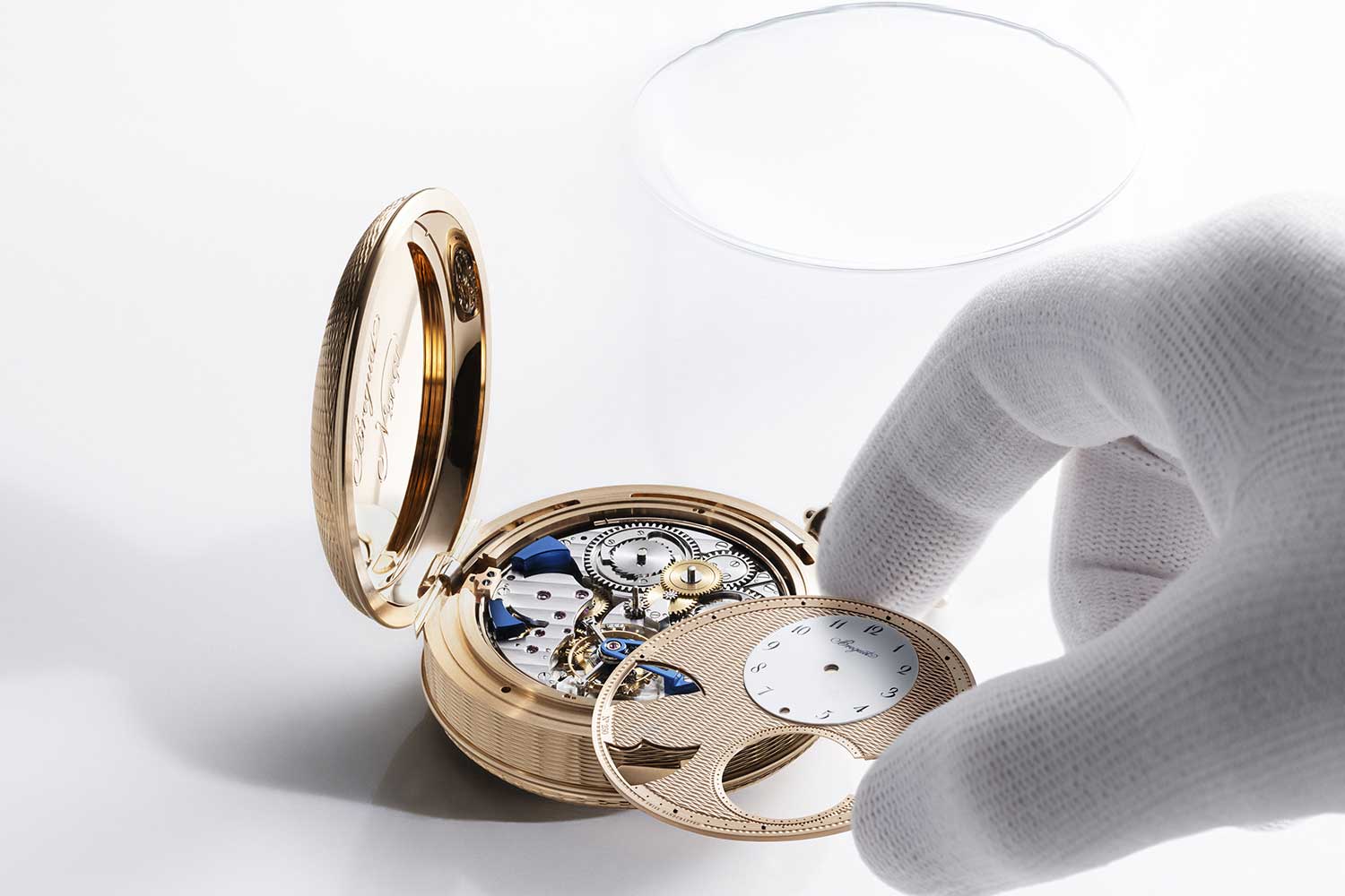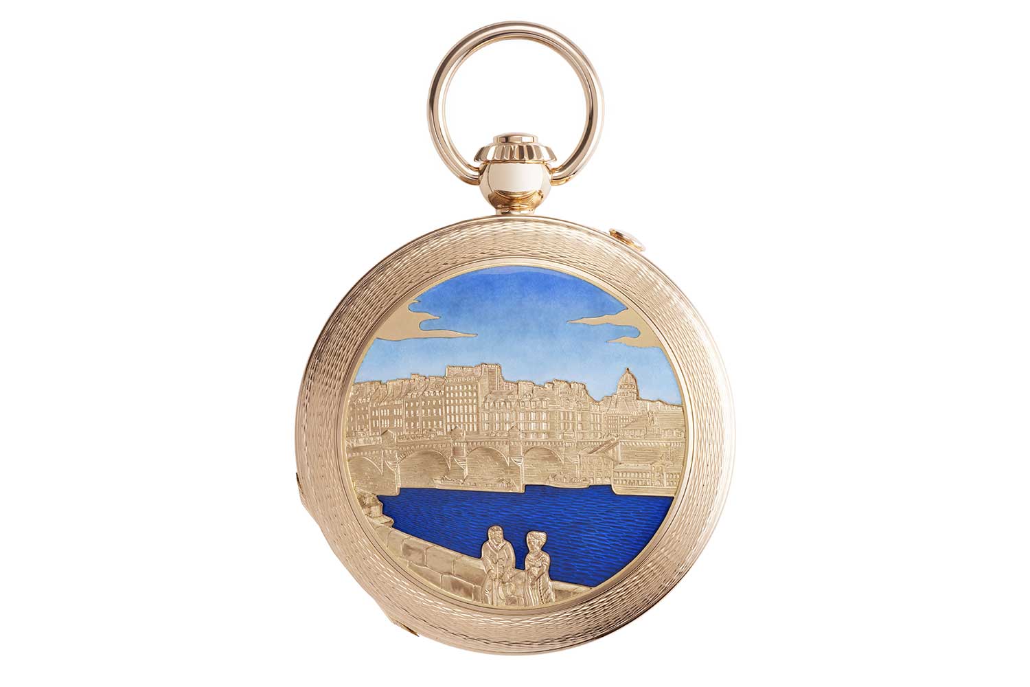 The casework and accessories reinforce the sense that this is a project conceived without compromise. Crafted from Breguet gold, the covers are engraved and enamelled to depict Île de la Cité (a natural island on the Seine River in central Paris that is the home to Quai de l’Horloge) and the Seine. The edges of the covers are guilloché in three dimensions, something almost never attempted due to the limitations of traditional decoration machinery; Breguet developed a dedicated technique to achieve it. The accompanying gold chain carries the same motif across its links, transforming what is usually an afterthought into an extension of the watch’s aesthetic logic.