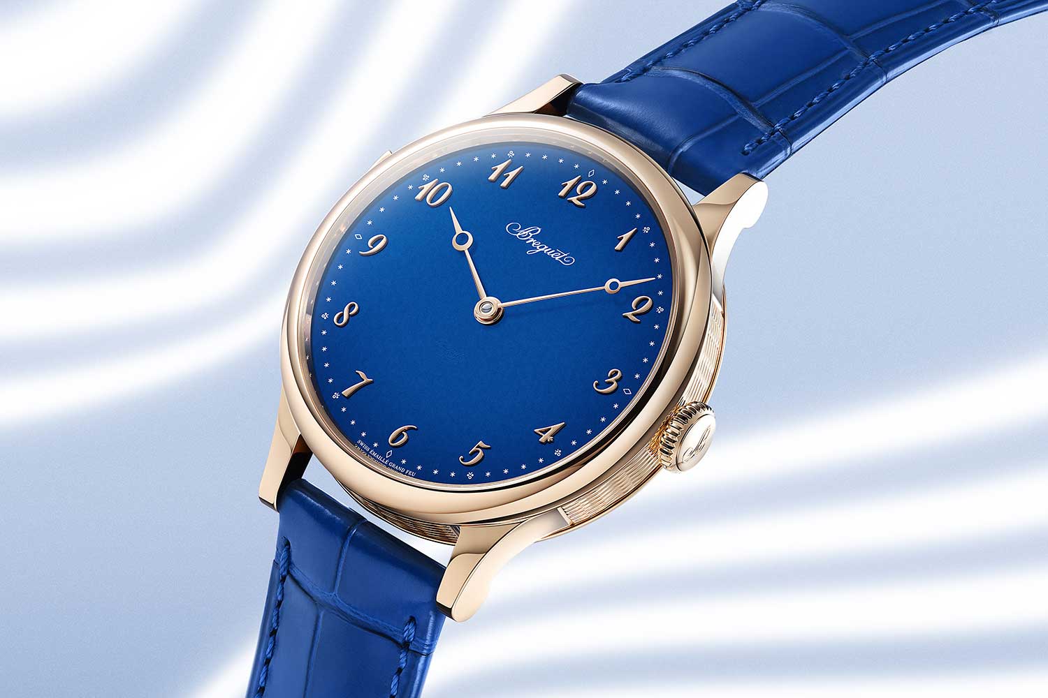 The dial is defined by its Bleu de France grand feu enamel, a tone chosen for the way it plays with light as much as for its cultural resonance whereby it appears across Parisian architecture, including the doorway of Breguet’s boutique. Applied to a white-gold base and fired repeatedly to achieve depth, the enamel gives the 7365 a clarity that suits the simplicity of the two-hand display. The applied numerals and secret signature at 6 o’clock preserve long-standing Breguet codes, but the colour itself creates a more contemporary mood, linking the watch to the broader French decorative tradition without relying on specific historical references.