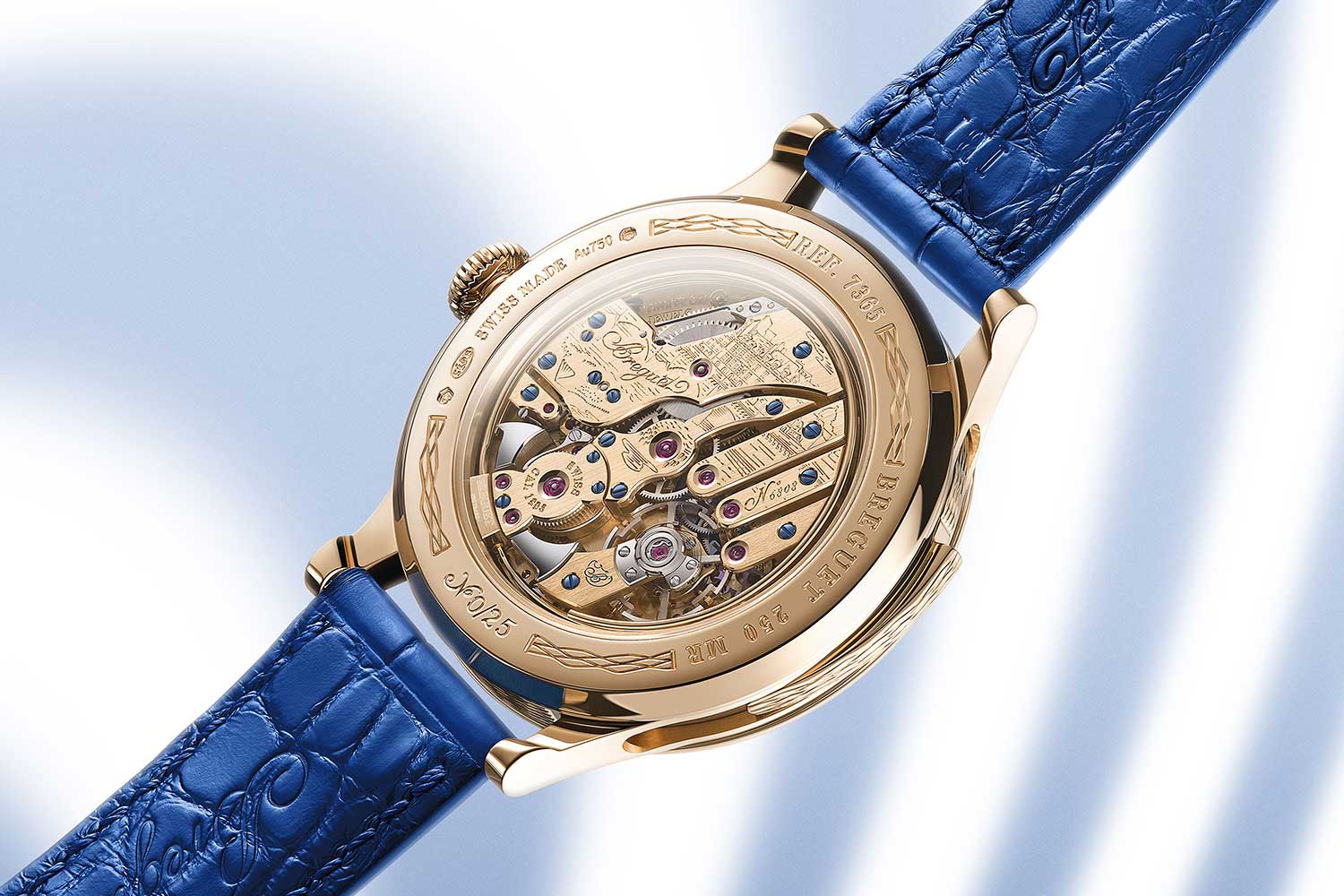 Turning the watch over changes the experience entirely. Rather than hide the striking mechanism beneath the enamel and guilloché of the dial, Breguet has allowed the grande sonnerie and minute repeater works to occupy the full visual field of the reverse side. The racks, snails and springs sit in a clear hierarchy, each one finished by hand and shaped so the sequence of the strike can be followed without effort. A Petit Trianon guilloché pattern created for the anniversary year frames the upper bridge and brings a sense of order to the complexity, and the consistent finishing across every component reinforces the idea that the visual language of the movement is as considered as its technical behaviour.