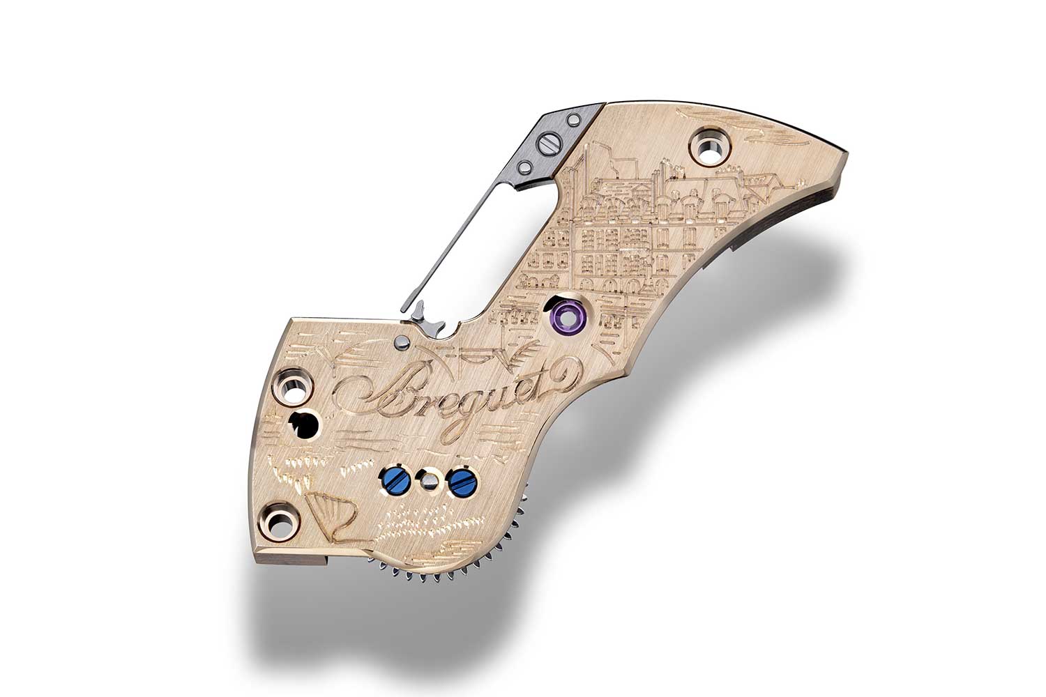 The movement engraving creates a quiet dialogue between past and present. At the top sits a scene drawn from the urban landscape around the Quai de l’Horloge, the setting in which Breguet first established his workshop. Below it, the engraver has placed the natural contours of the Vallée de Joux, home to the modern manufacture. The two images meet at the centre of the bridge, creating a deliberate tension rather than a literal mirror. It is a thoughtful way of acknowledging the maison’s dual identity without turning the caseback into an illustrated narrative. “We wanted the engraving to reflect both sides of Breguet,” Kissling explains. “The Parisian origin and the Swiss manufacture are two halves of the same story.”