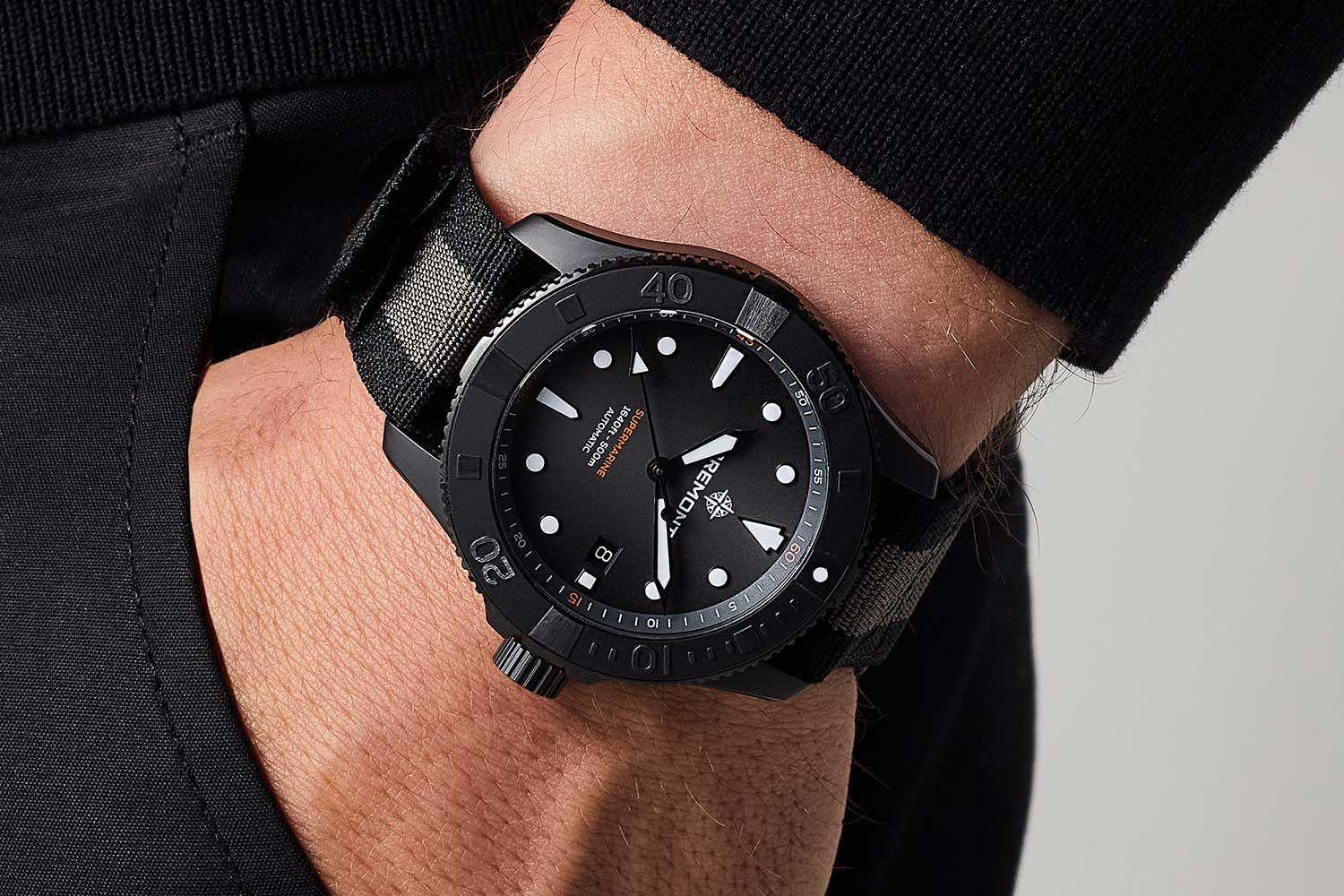 The date model comes in two variations. There is a more subdued black model with subtle orange dial accents and a pleasingly quiet white-on-black date window at three o’clock. The stand-out model of the line, however, could be said to be the Supermarine 300M Date Bi-Color, a chocolate brown dialed watch with rose gold accents and a rose gold bezel that looks particularly handsome on the characterful stainless steel bracelet.